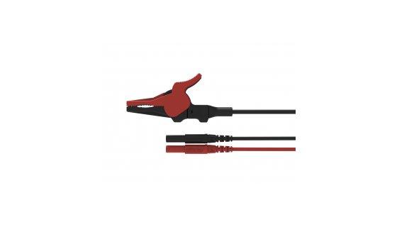 2 bezpečnostní zástrčky s lamelovým košíkem namontované na vysoce ohebném, dvojitě izolovaném PVC kabelu 1 mm² a bezpečnostní kelvinová svorka
