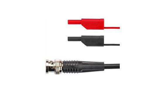 2. strana: 2x zástrčky s bezpečnostním lamelovým košíkem Ø 2 mm s integrovanou zásuvkou, namontované na vysoce ohebném izolovaném PVC kabelu 0,5 mm²